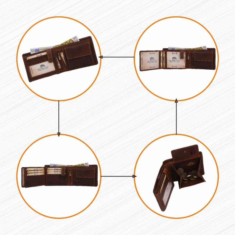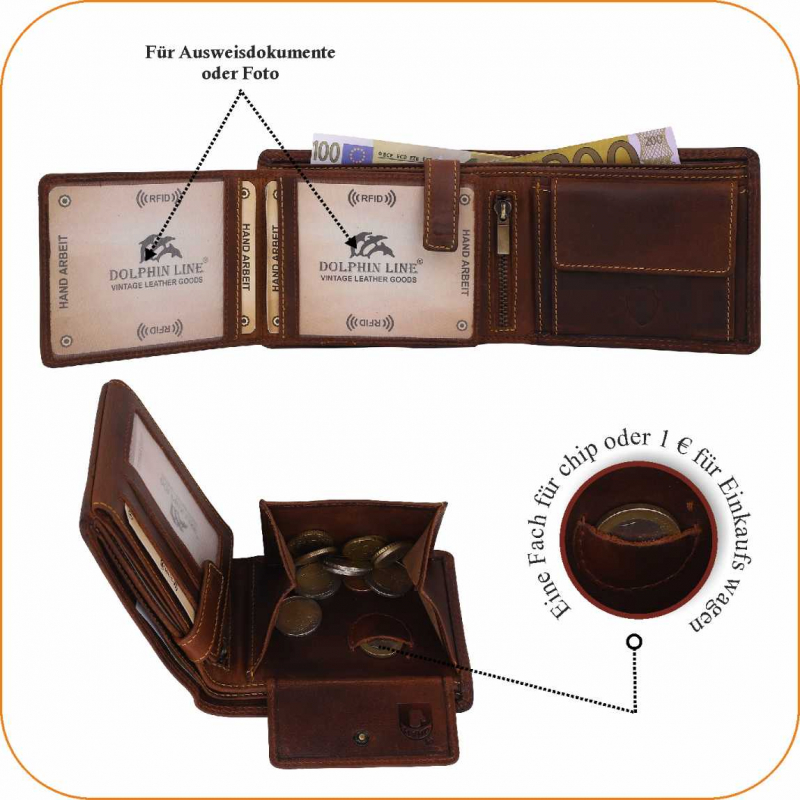 2 Fächer für Geldscheine, 8 Kreditkartenfächer, 2 Fächer mit Sichtfenster,  (für Ausweis usw), 1 Lasche mit Druckknopf, 2 extra Fächer, 1 Reißverschlußtasche, 1 Münzfach.