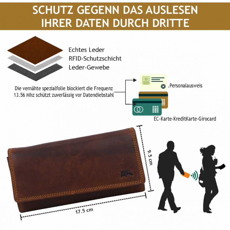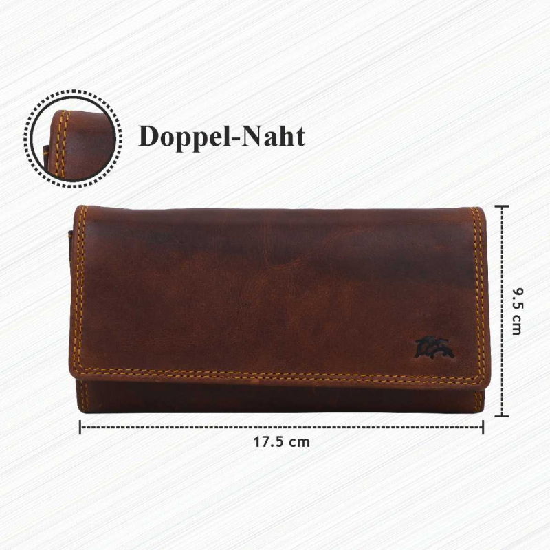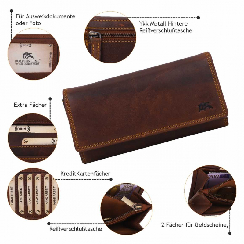 2 Fächer für Geldscheine, 6 Kreditkartenfächer, Klare PVC-Fächer (für Ausweis oder Foto usw), 1 mit Reißverschluß, 4 extra Fächer, 1 Reißverschlusstasche außen, Lasche mit Druckknopf.