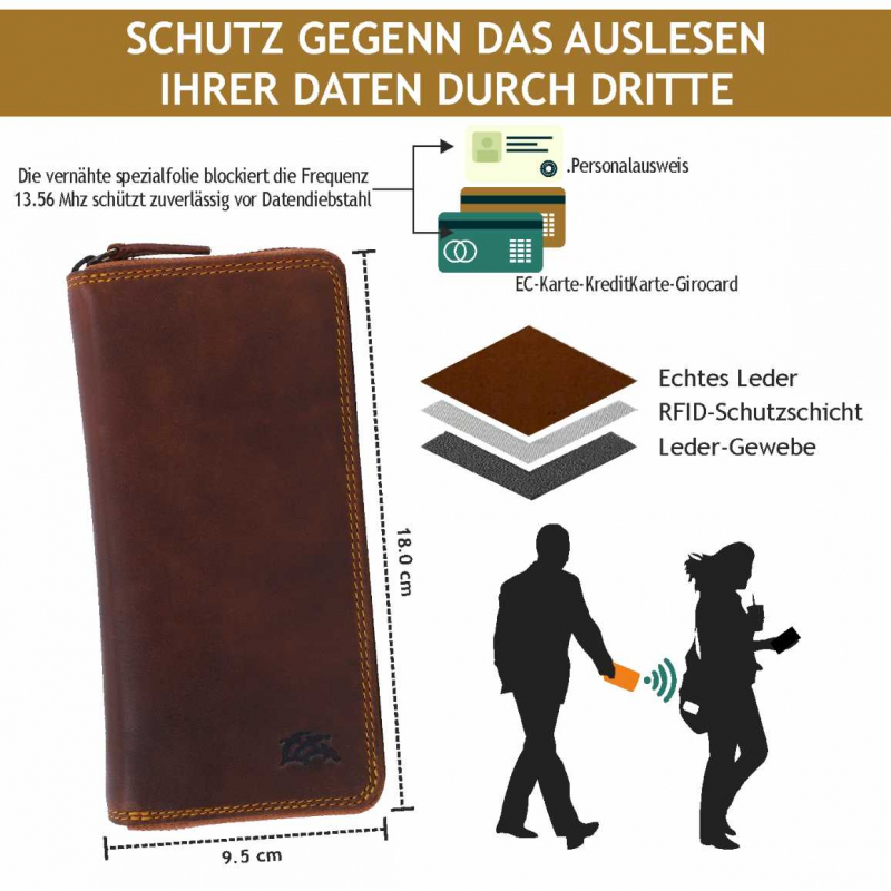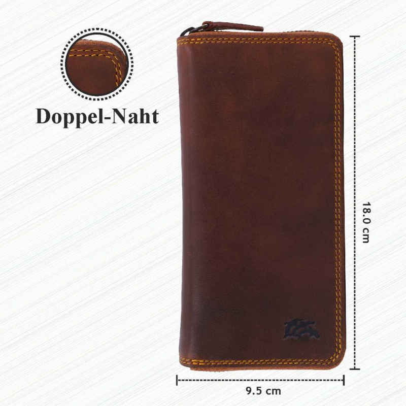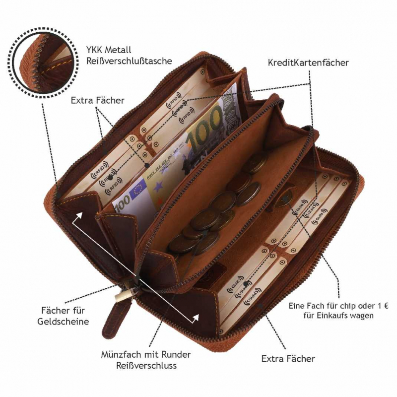 2 Fächer für Geldscheine, 12 Kreditkartenfächer, 3 extra Fächer, 1 Reißverschlusstasche innen, 1 Münzfach, 1 Reißverschlußtasche, Reißverschlusstasche außen.