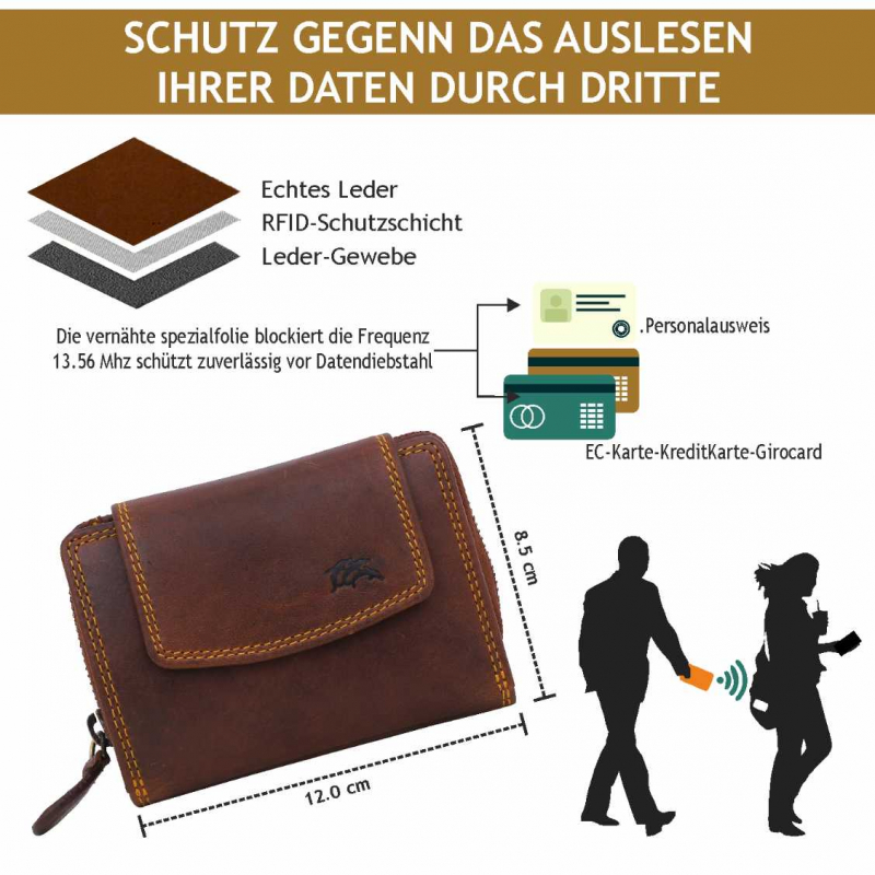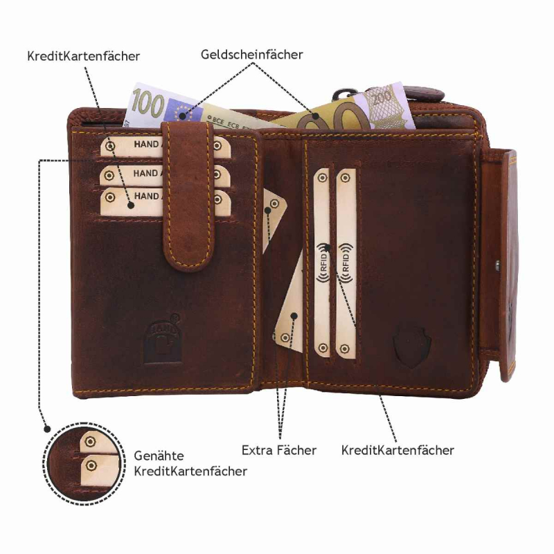 2 Fächer für Geldscheine, 11 Kreditkartenfächer, 2 extra Fächer, 2 Klare PVC-Fächer (für Ausweis oder Foto usw), 1 Lasche mit Druckknopf, 1 geteiltes Münzfach mit Reißverschluß 5 Trennwand mit Runde Reißverschlus, Klappe mit Druckknopf.