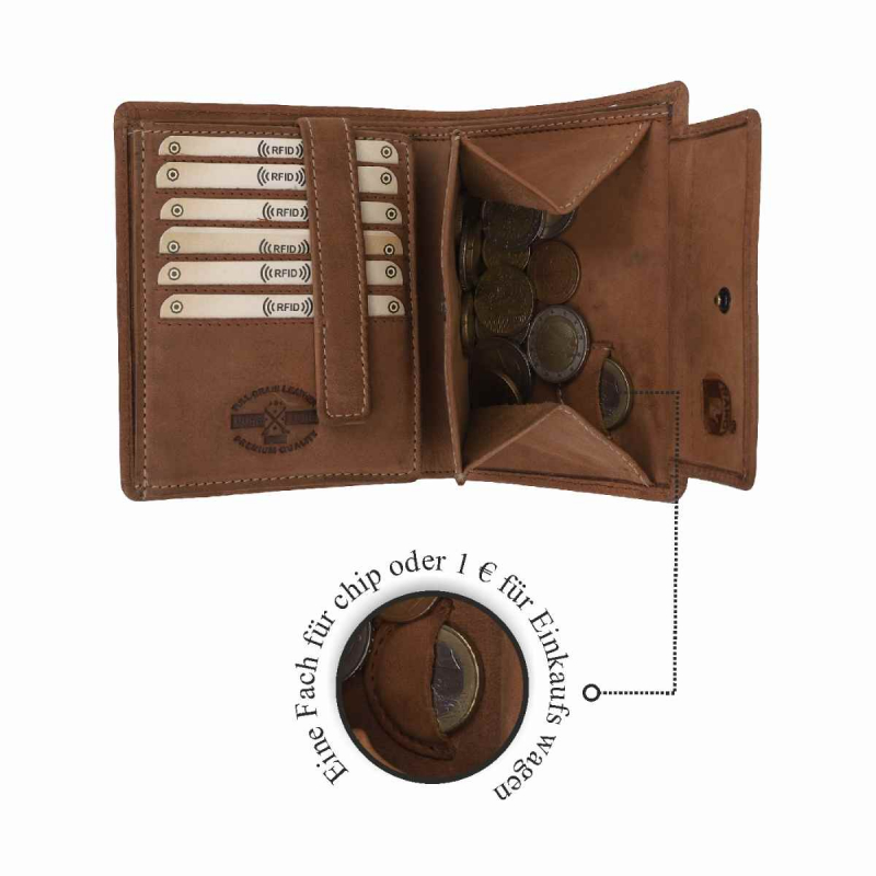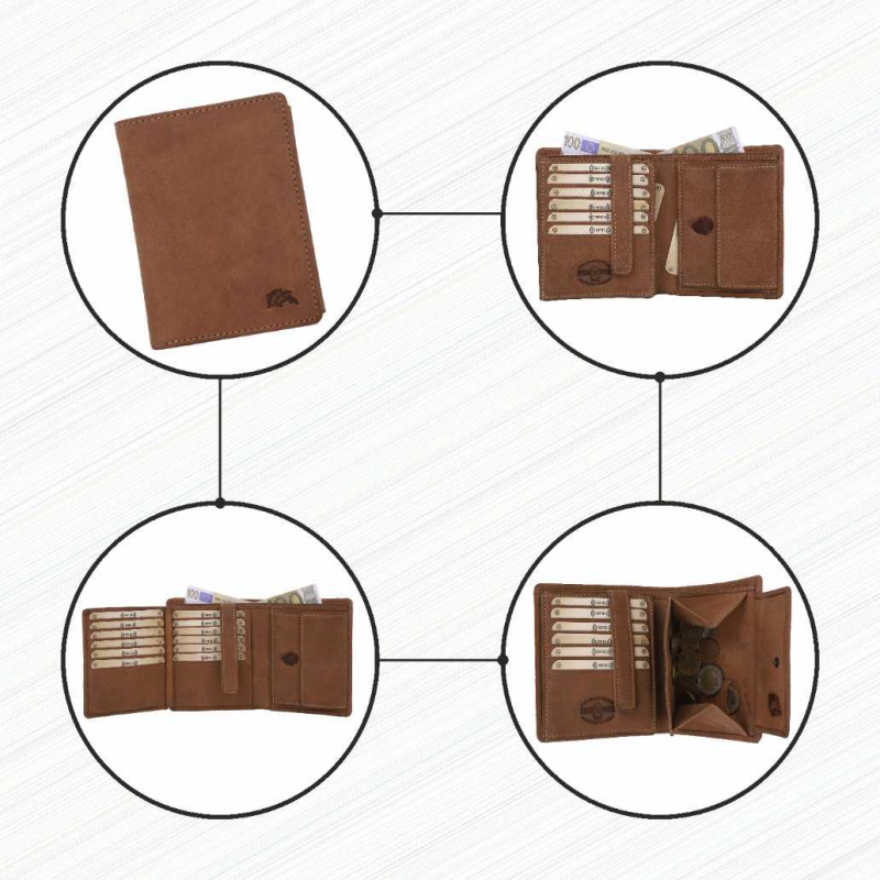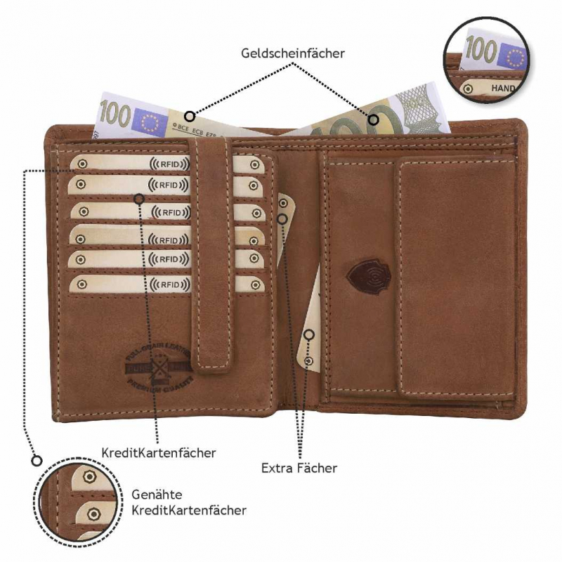 2 Fächer für Geldscheine,18 Kreditkartenfächer,1 Lasche mit Druckknopf, 2 extra Fächer, 1 Reißverschlußtasche,1 Münzfach.