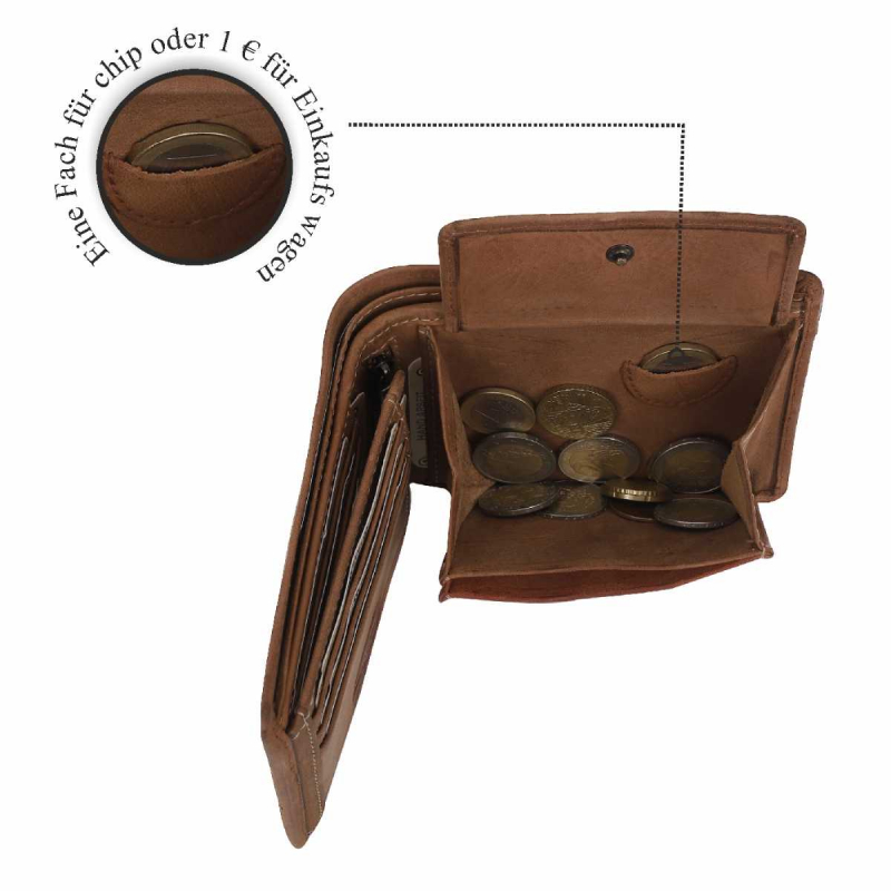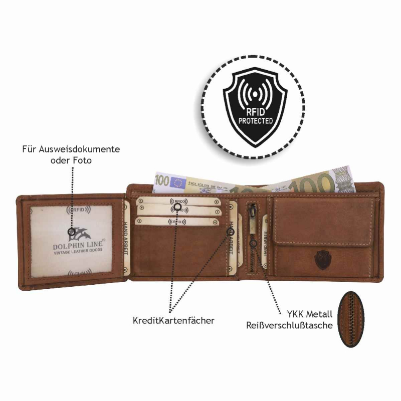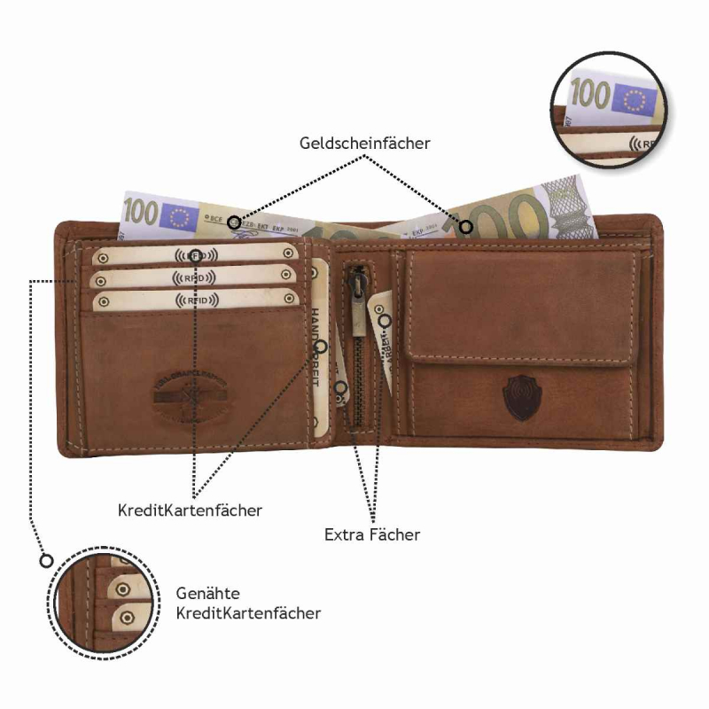 2 Fächer für Geldscheine,7 Kreditkartenfächer, 1 Fächer mit Sichtfenster, (für Ausweis usw), 4 extra Fächer, 1 Reißverschlußtasche, 1 Münzfach.