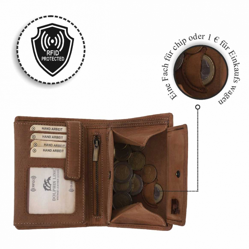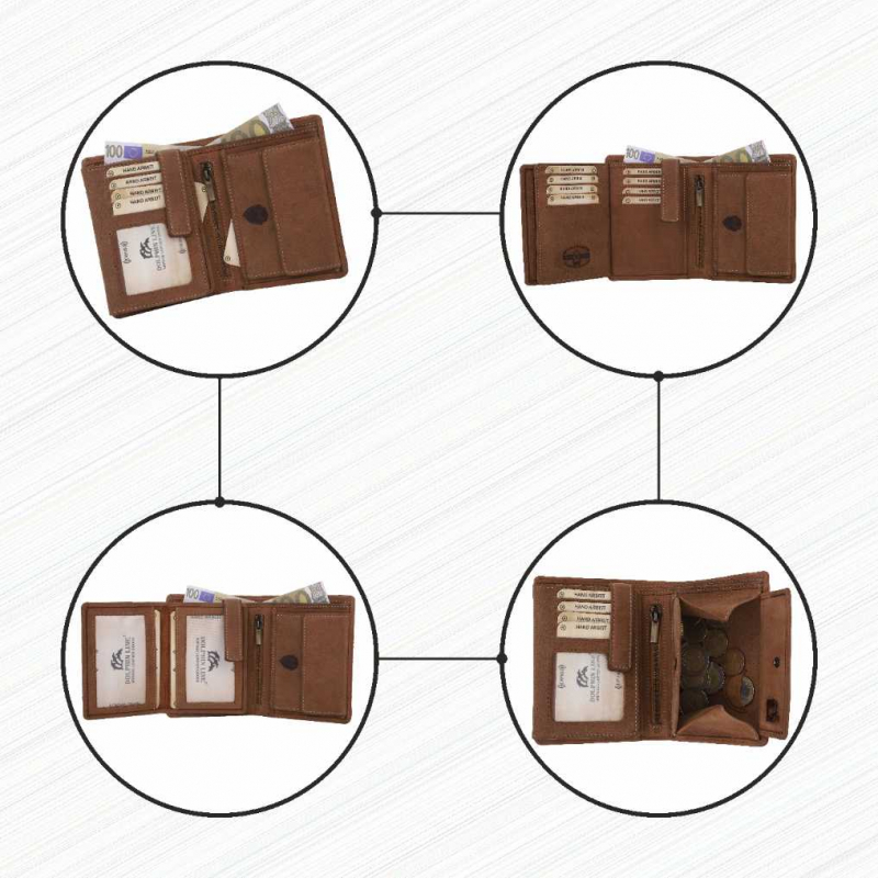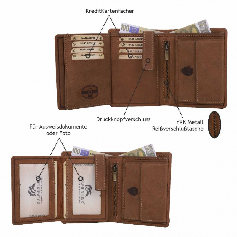 2 Fächer für Geldscheine,12 Kreditkartenfächer, 2 Fächer mit Sichtfenster, (für Ausweis usw),1 Lasche mit Druckknopf, 2 extra Fächer, 1 Reißverschlußtasche, 1 Münzfach.