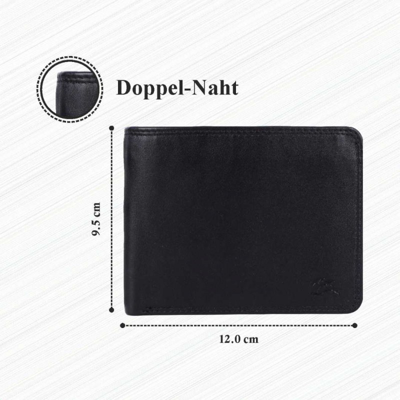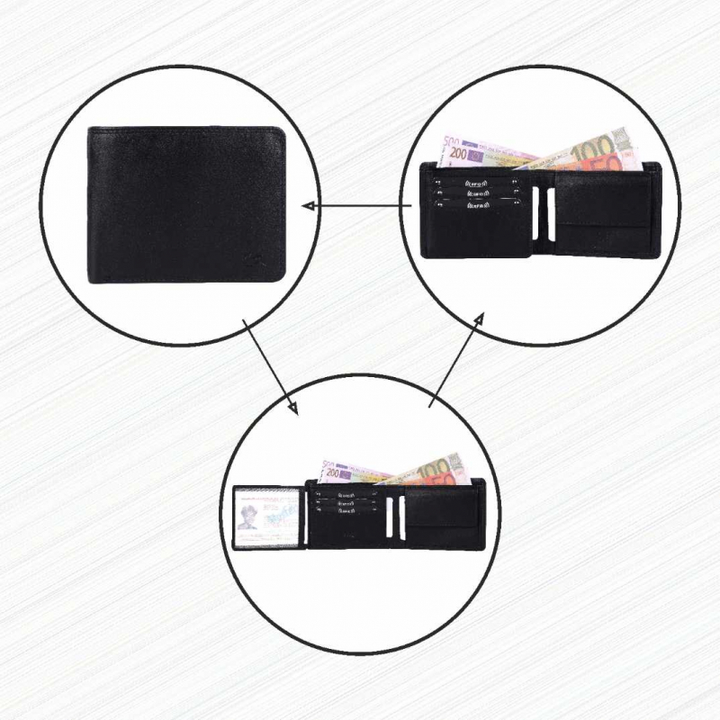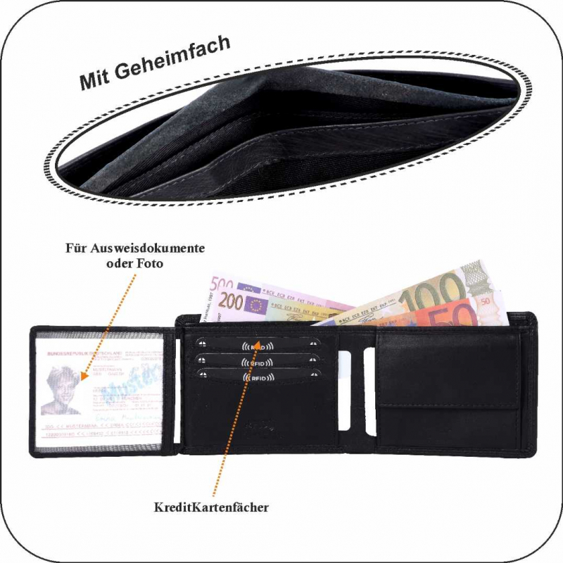 2 Fächer für Geldscheine, 1 Mit Geheimfach, 6 Kreditkartenfächer, 1 Fächer mit Sichtfenster, (für Ausweis usw), 2 extra Fächer, 1 Münzfach.