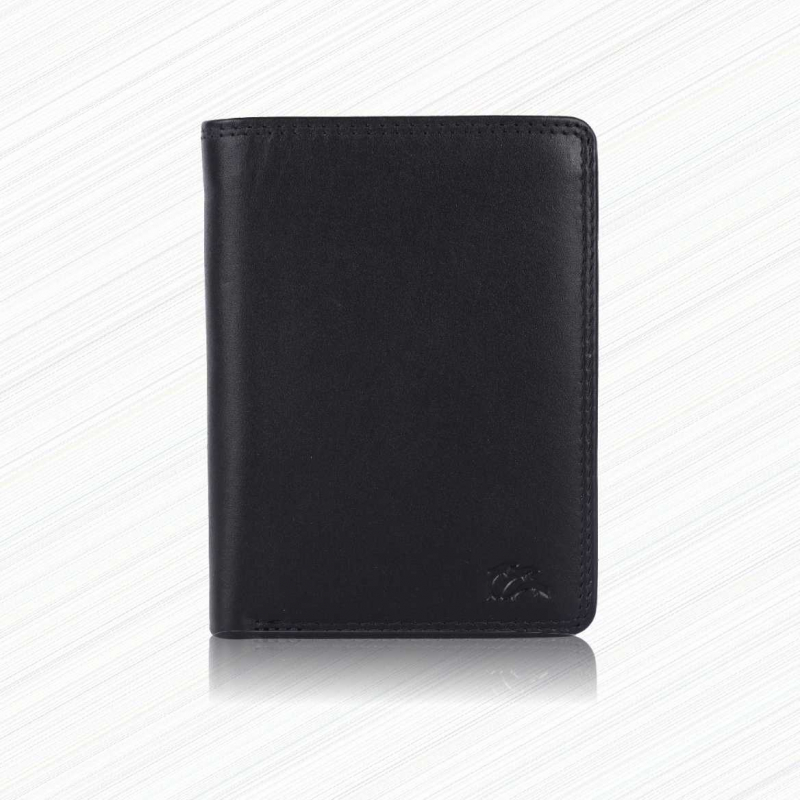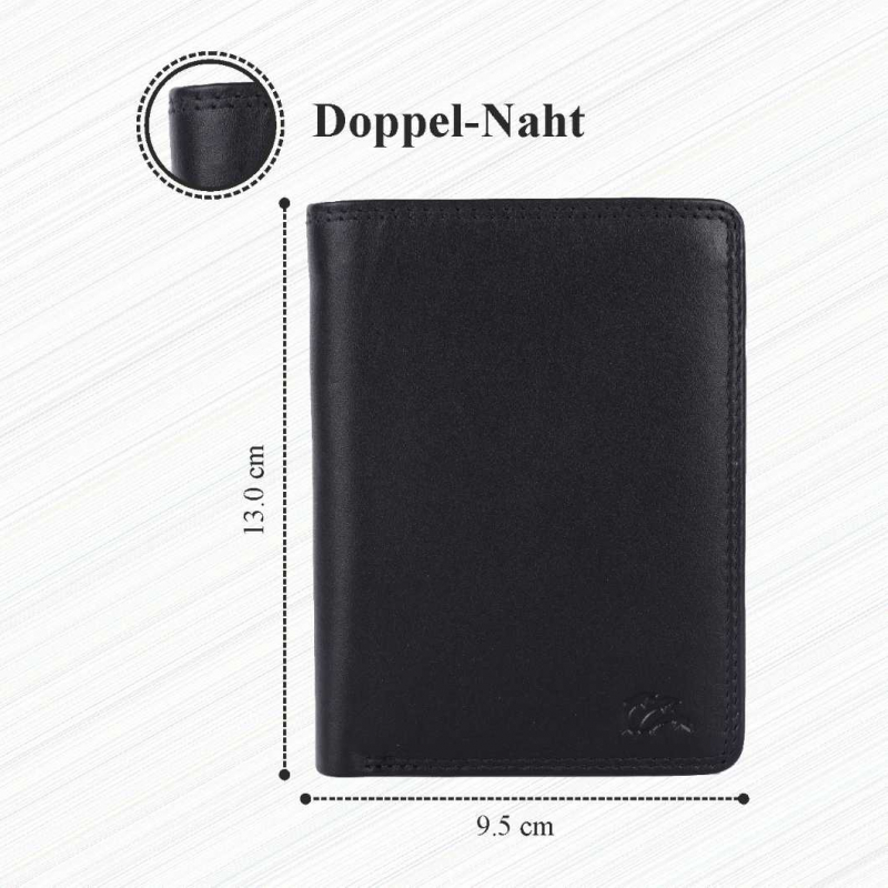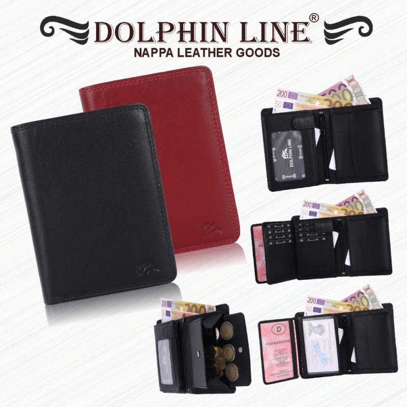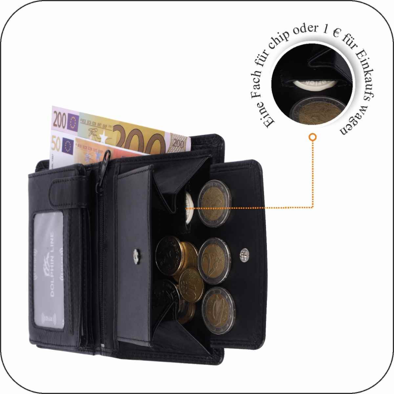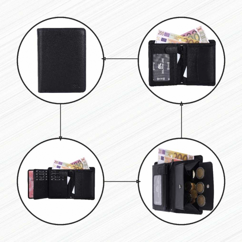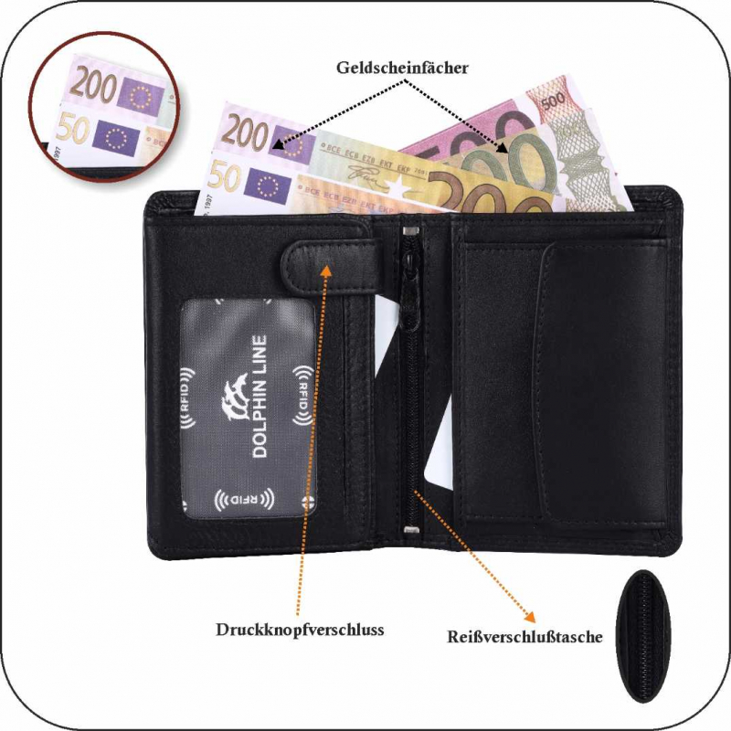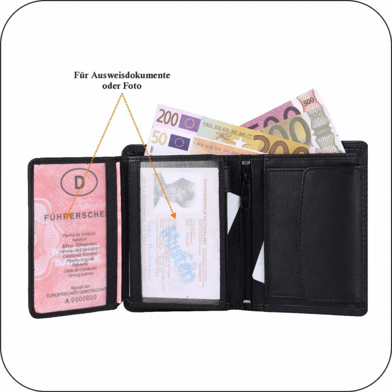 2 Fächer für Geldscheine, 8 Kreditkartenfächer, 2 Fächer mit Sichtfenster, (für Ausweis usw), Lasche mit Druckknopf, 2 extra Fächer, 1 Reißverschlußtasche, 1 Münzfach.