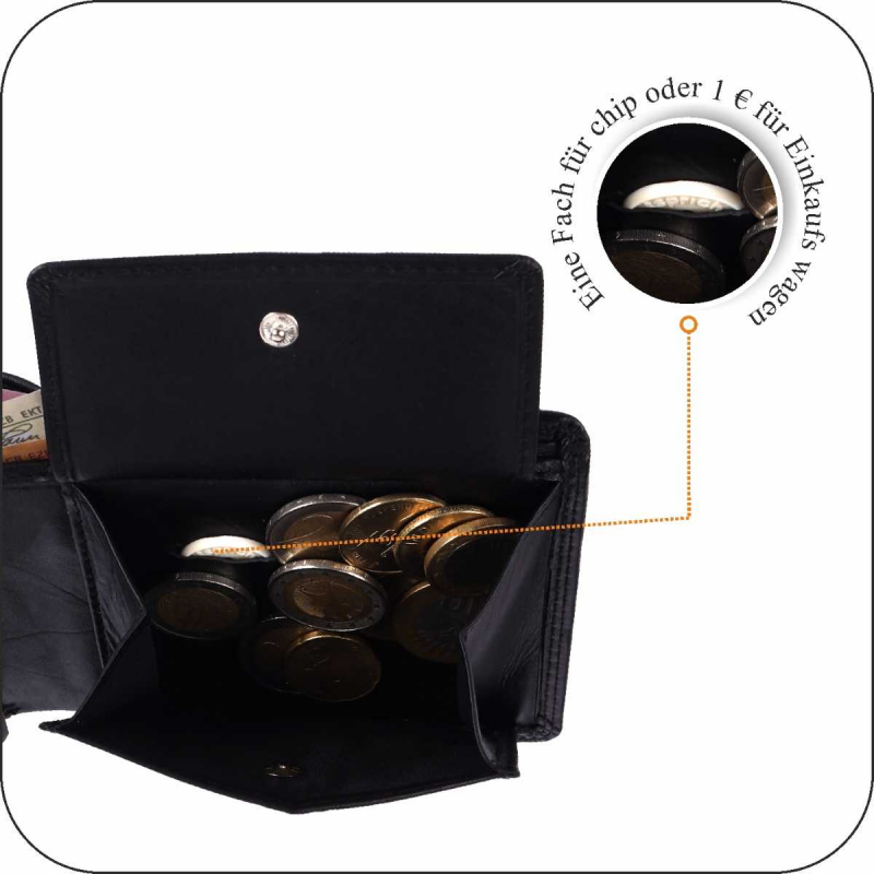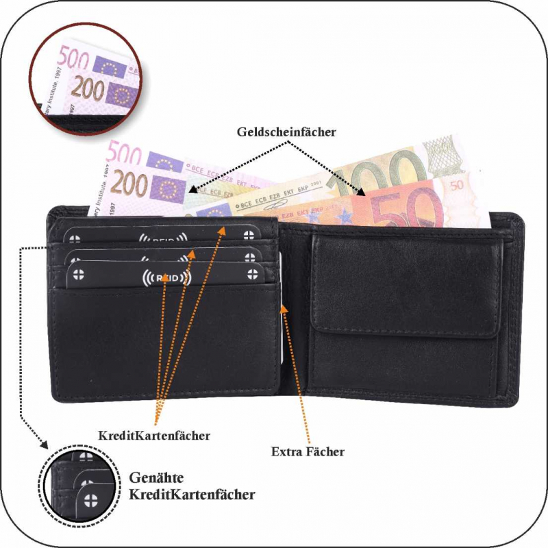 2 Fächer für Geldscheine, 6 Kreditkartenfächer, 1 Fächer mit Sichtfenster (für Ausweis usw), 2 extra Fächer, 1 Münzfach.