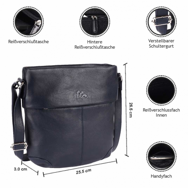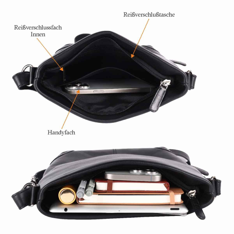 1 Fächer, 1 Handytaschen, 1 Reißverschlusstasche im Fach, 1 Reißverschluss-Tasche auf der Rückseite, Verstellbarer Schultergurt.