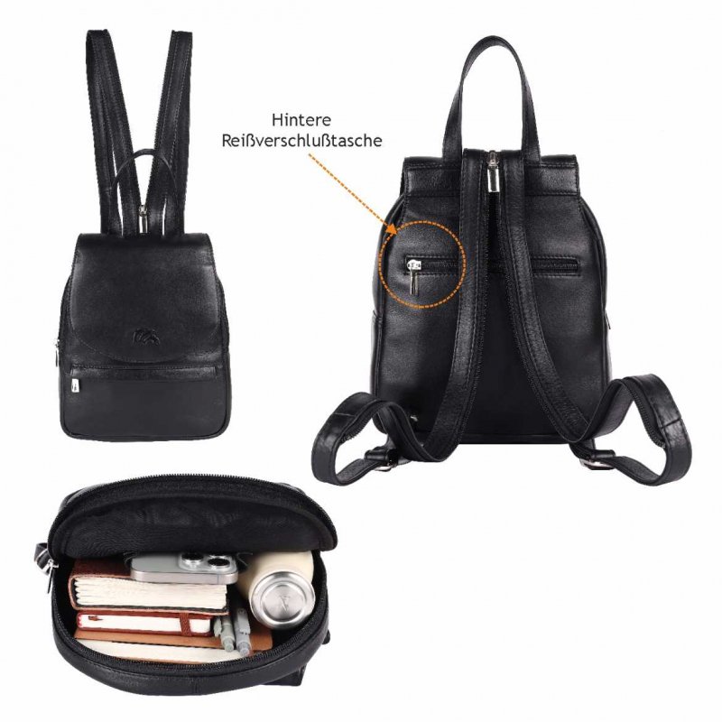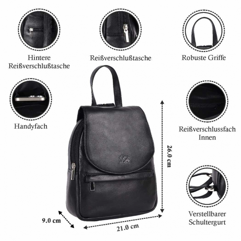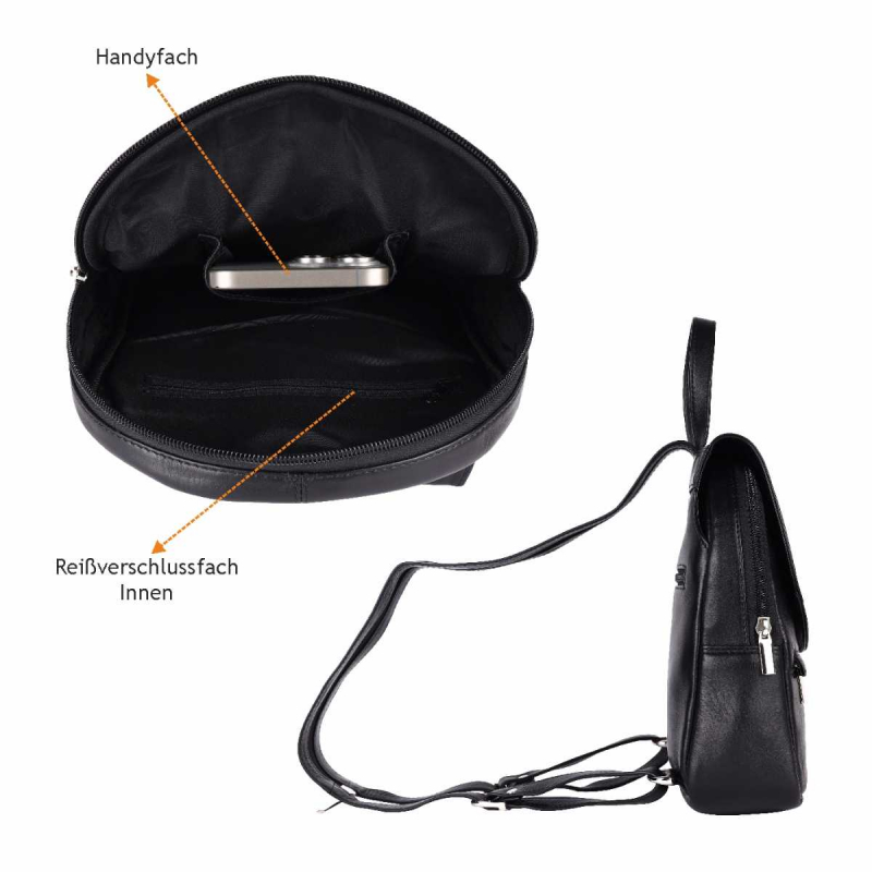 1 Fächer, 1 Handytaschen, 1 Fach vorne mit Reißverschluß, 1 Reißverschlusstasche im Fach, 1 Reißverschluss-Tasche auf der Rückseite, Verstellbarer Schultergurt.