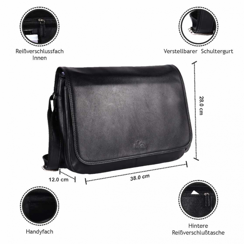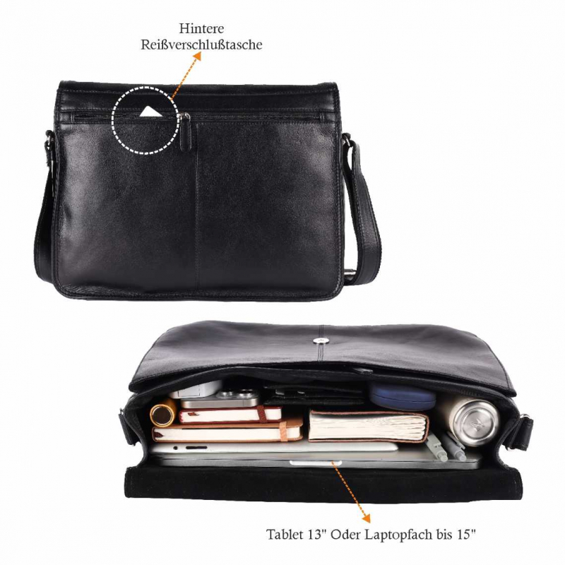 1 Fächer, 1 Handytaschen, 2 Reißverschlusstasche im Fach, 1 Kreditkartenfächer im Fach, Im Inneren befindet sich ein gepolstertes Fach für Tablet 13" / Laptop bis 15" Zoll, 1 Reißverschluss-Tasche auf der Rückseite, Verstellbarer Schultergurt max.150.cm.