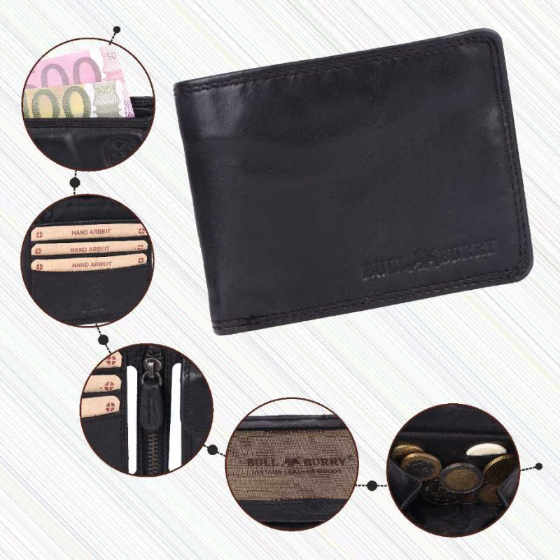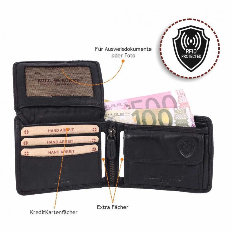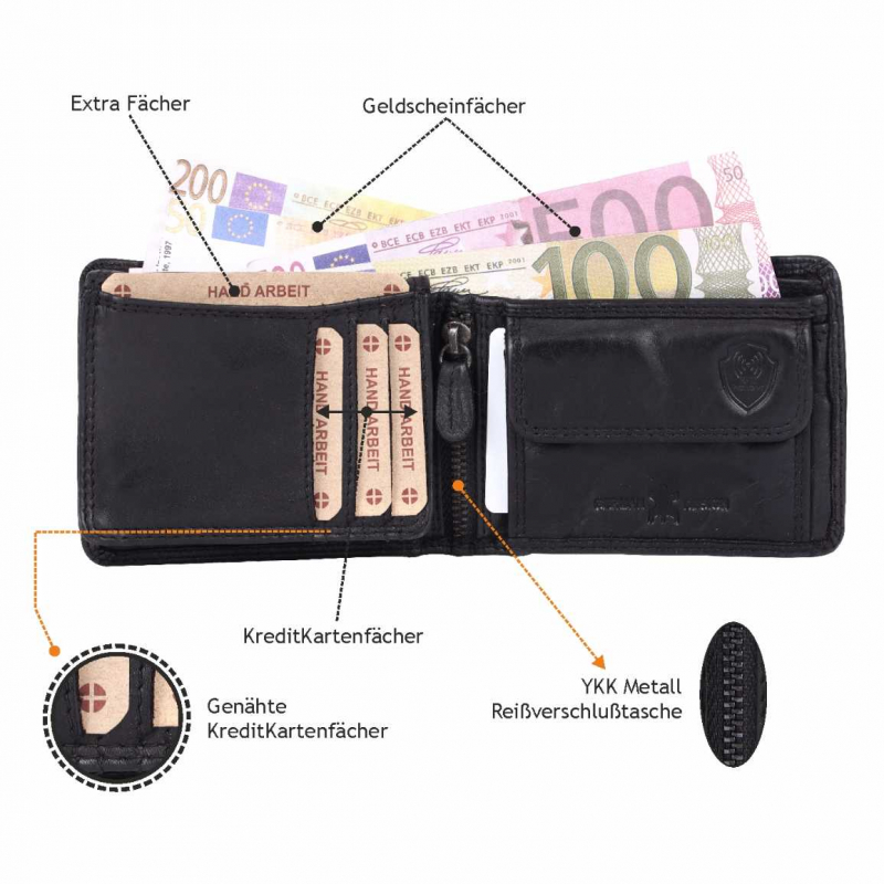2 Fächer für Geldscheine, 6 Kreditkartenfächer, 1 Fächer mit Sichtfenster (für Ausweis usw), 3 extra Fächer, 1 Reißverschlußtasche, 1 Münzfach.