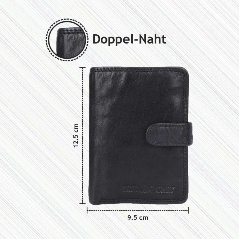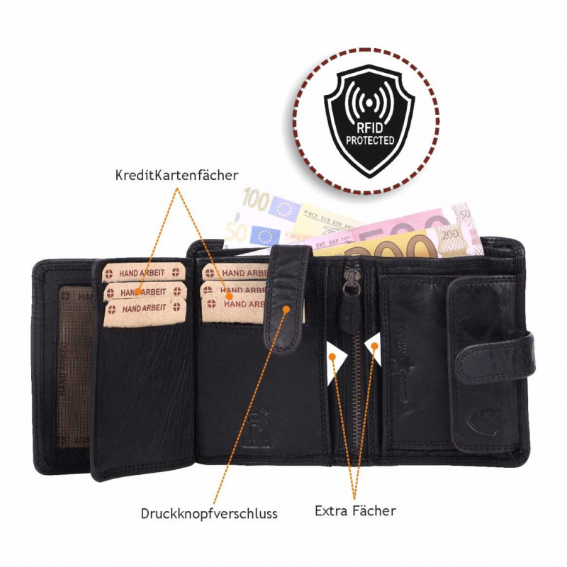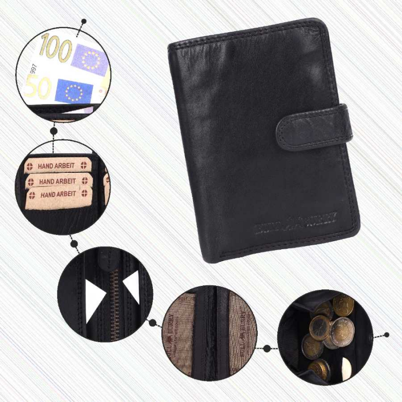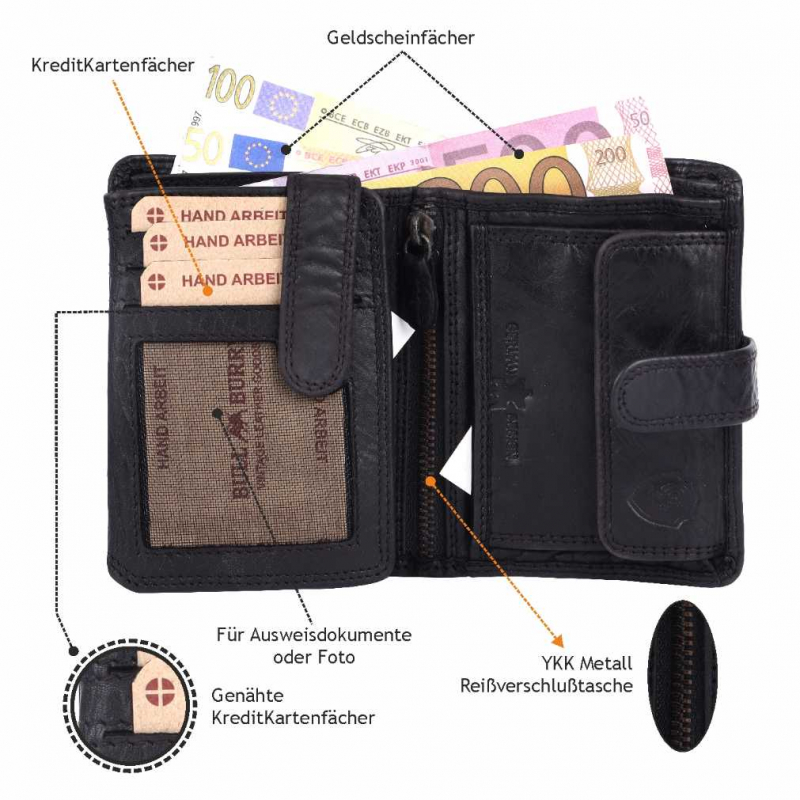 2 Fächer für Geldscheine, 8 Kreditkartenfächer, 1 Lasche mit Druckknopf, 3 Fächer mit Sichtfenster, (für Ausweis usw), 3 extra Fächer, 1 Reißverschlußtasche, 1 Münzfach, 1 Lasche mit Druckknopf aussen.